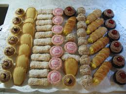 frutta, cannoncino, meringa e dolci di marzapane, cannoli e